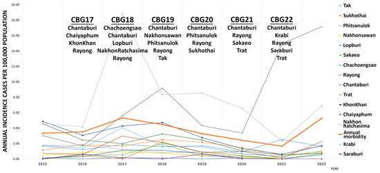 Annual leptospirosis incidence per 100,000 population in selected provinces, aligned with training site locations and the national average morbidity rate in Thailand from 2015 to 2022. The CBG training provinces for each year were listed under the respective training year (CBGFY). The annual incidence per 100,000 population and morbidity rates in selected provinces from 2015 to 2022 were obtained from the MoPH Annual Epidemiology Surveillance Report [11].