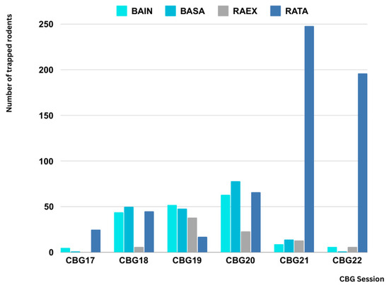 Number of trapped rodents by species across trapping sessions (2017–2022) in CBG sites. The graph shows the four most common rodent species captured during each trapping session from CBG17 to CBG22. Species include B. indica (BAIN), B. savilei (BASA), R. exulans (RAEX), and R. rattus (RATA), represented by different shades. The number of rodents trapped varies by session and species, with R. rattus showing a significant increase in CBG21 and CBG22.