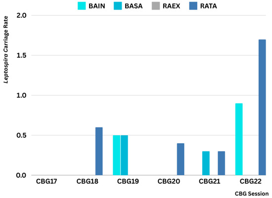 Leptospira carriage rate by rodent species across trapping sessions (2017–2022) in CBG sites. The graph depicts the rate of Leptospira carriage in the four most commonly trapped rodent species, including B. indica (BAIN), B. savilei (BASA), R. exulans (RAEX), and R. rattus (RATA), across sessions from CBG17 to CBG22. While the data reveal fluctuations in carriage rates among the species and sessions, with R. rattus exhibiting the highest rate in CBG22, R. exulans showed no detectable Leptospira carriage throughout the study period.