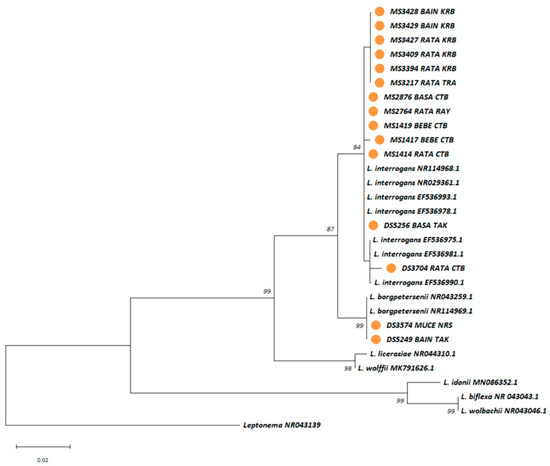 A maximum likelihood phylogenetic tree was constructed based on nearly full-length 16S rRNA gene sequences using the Kimura 2-parameter nucleotide substitution model. Sequences from the four Leptospira isolates obtained from trapped rodents are represented by orange circles. Bootstrap estimates (1000 replicates) are shown above the branches for nodes with >50% support. The abbreviations used in the figure for rodent species and provinces are as follows: BAIN = Bandicota indica, RATA = Rattus rattus, CTB = Chantaburi, RAY = Rayong, and TRA = Trat.