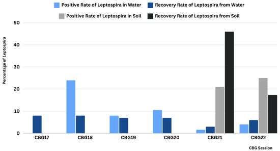 We tested Leptospira persistence in 413 water samples and 130 soil samples from exposed environmental areas. Soil samples were collected only in 2021 and 2022. The pH and temperature ranges measured in the environmental samples were 6.2–7.8 and 21.7–24.6 °C for water samples and 4.5–7.6 and 22.0–25.0 °C for soil samples.