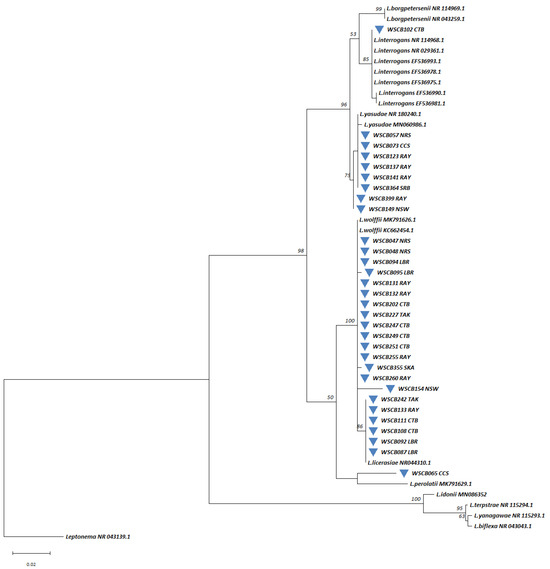 Species identification of Leptospira isolates, including 4 rodent isolates, 27 water isolates, and 40 soil isolates, was performed by amplifying bacterial 16S rDNA fragments. PCR amplification was conducted using 300 nM 16S rRNA primers fD1/rD1 [27]. The amplification process was carried out on a SimpliAmp™ Thermal Cycler (Applied Biosystems, Foster City, CA, USA) with an initial denaturation at 94 °C for 2 min, followed by 35 cycles of 92 °C for 15 s, 63 °C for 30 s, and 68 °C for 2 min, with a final extension at 68 °C for 5 min. Amplicons were analyzed using 1.5% gel electrophoresis, purified, and sent to Macrogen Inc. (Seoul, Republic of Korea) for sequencing with the primers lepto16S11f, lepto16S505f, and lepto16S1006f, as previously described [28]. Between 90% and 93% of the 16S rRNA gene sequences from Leptospira isolates were deposited in GenBank (accession numbers provided in Table S9). Maximum likelihood trees were constructed using the Kimura 2-parameter model based on the 16S rRNA gene sequences, with bootstrap analysis performed using MEGA v.11 [26]. Reference sequences retrieved from GenBank were represented in the phylogenetic tree as Leptospira spp._Accession number, while the isolates from this study were represented as collection number_Host species (for rodent)_collecting province or collection number (for water or soil)_collecting province.