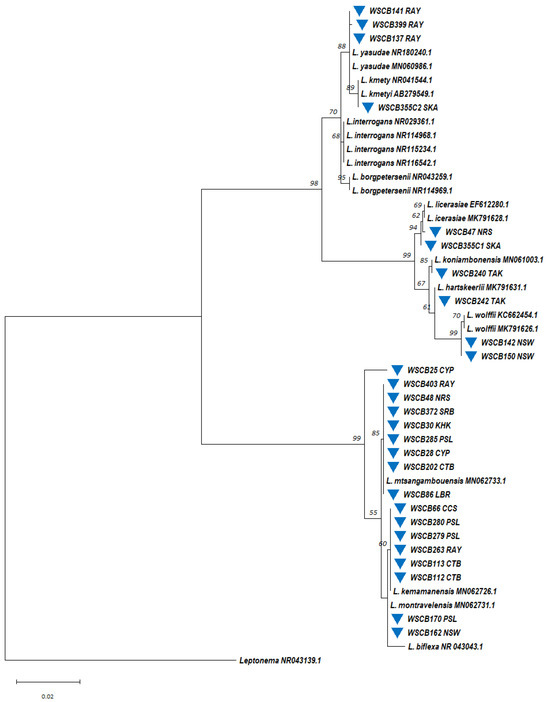 This study investigated the circulating and phylogenetic distribution of Leptospira in water samples collected across surveillance sites over six years. Of the 413 samples analyzed, 27 (6.5%) yielded Leptospira spp. isolates through culturing, with an average recovery rate of 6.5 ± 1.4 isolates per year. Molecular phylogenetic analysis based on the 16S rRNA gene (Figure 10) revealed that most isolates (n = 17) belonged to the saprophytic group, followed by the intermediate group (n = 6) and a low virulence subclade within the pathogen group (n = 4). Further analysis identified isolates genetically related to L. kmetyi (n = 1) and L. yasudae (n = 3) within the pathogenic group and L. licerasiae (n = 2), L. wolffii (n = 2), L. hartskeerlii (n = 1), and L. koniambonensis (n = 1) in the intermediate group. The saprophytic group included isolates related to L. mtsangambouensis (n = 8), L. montravelensis (n = 2), and L. kemamanensis (n = 6). One saprophytic isolate (WSCB25 CYP) remained unidentified, potentially representing a novel Leptospira species.