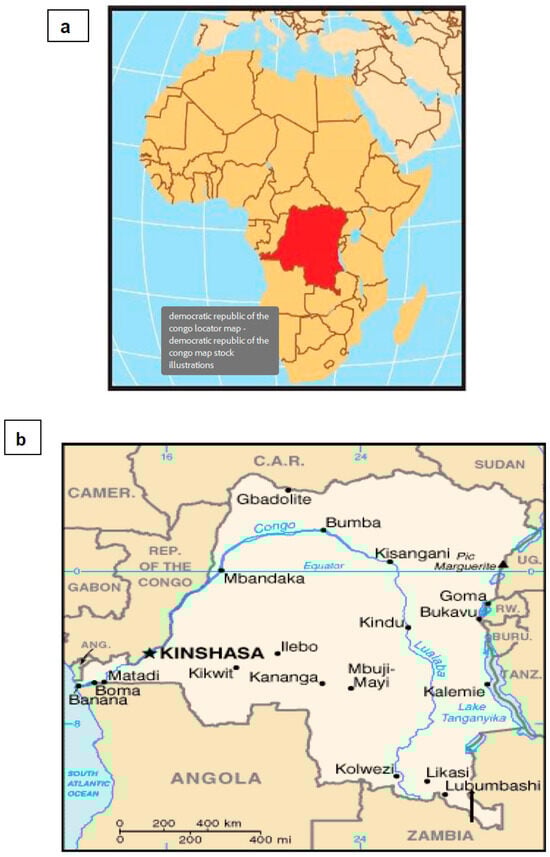 Location of soil sampling sites. (a) Democratic Republic of Congo (red) on a map of Africa; (b) details in the map of Democratic Republic of Congo. The arrow indicates the sites’ location (Lubumbashi). Adapted from Google Map, accessed in June 30, 2023. Site 1—Urban area (11.644767 S, 27.557596 E), Site 2—agricultural dry land (11.66034 S, 27.556109 E); Site 3—agricultural wetland (11.656886 S, 27.575442 E), Site 4—remediated tailing (11.608833 S, 27.476675 E).