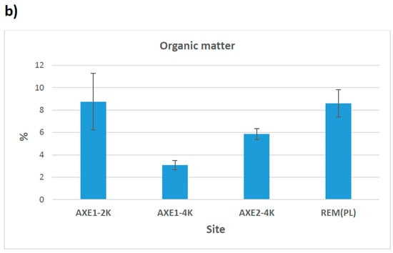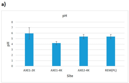 Means levels of (a) pH and (b) organic matters at each of the targeted sites, Axe1-2k: site 1 (residential area); Axe1-4k: site 2 (dry agricultural land); Axe-4k: site 3 (wet agricultural field); and Rem: the remediated tailing (site 4). Bars represent standard errors.
