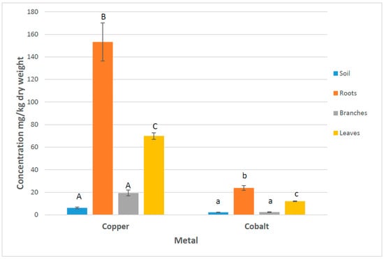Bioavailable metal concentration in soil rhizosphere and total metal concentration in Leucaena leucocephala roots, branches, and leaves growing in remediated tailing (site 4). Means above error bars with different letters for each metal (copper and cobalt) are significantly different (p ≤ 0.05). Bars represent standard errors. Means with different letters for each metal (copper and cobalt) are significantly different (p ≤ 0.05).