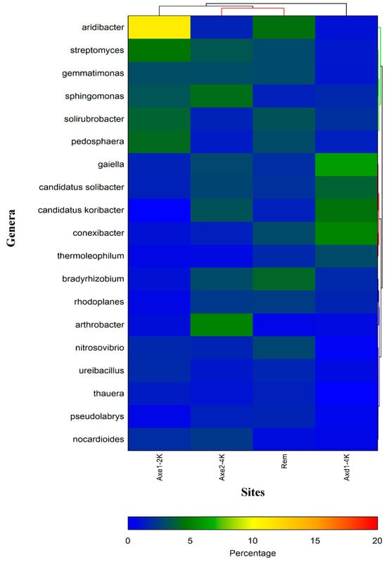 Bacterial communities: dual hierarchal dendrogram evaluation of the taxonomic classification data with each sample clustered on the X-axis labeled based upon the treatment. Samples with more similar microbial populations are mathematically clustered closer together. The genera (consortia) are used for clustering. Thus, the samples with more similar consortia of genera cluster closer together with the length of the connecting lines (top of heatmap) related to the similarity; shorter lines between two samples indicate closely matched microbial consortia. The heatmap represents the relative percentages of each genus. The predominant genera are represented along the right Y-axis. The legend for the heatmap is provided in the bottom, representing the relative abundance (percentage of each genus). Axe1–2K represents site 1 (residential area); Axe1–4K or Axd1-4 represents site 2 (dry agricultural land); Axe2–4K represents site 3 (wet agricultural field); and Rem represents remediated tailing (site 4).