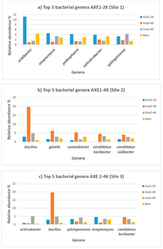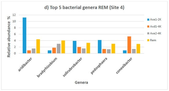 Top five bacterial genera and their relative abundance in soil samples from each site along with other sites: (a) Axe1-2K (site—1: residential area); (b) Axe1-4k or Axd1-4K (site 2: agricultural dry land); (c) Axe2-4K (site 3: agricultural wetland); and (d) Rem (remediated tailing) (site 4). Data in percentages.