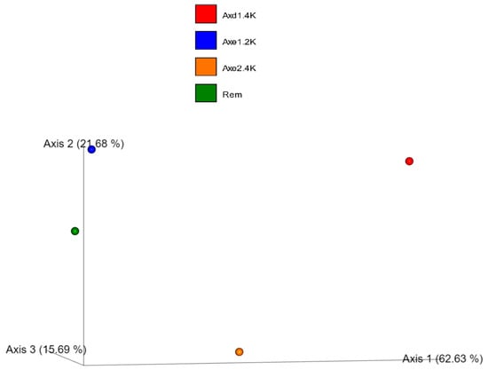 Principal coordinate plot of weighted UniFrac data for bacterial communities. Axe1–2k represents site 1 (residential area); Axe1–4k or exd1-4k: site 2 (agricultural dry land); Axe2–4k: site 3 (agricultural wetland); and Rem: remediated tailing (site 4). The plot was generated using amplicon sequence variant (ASV) data.