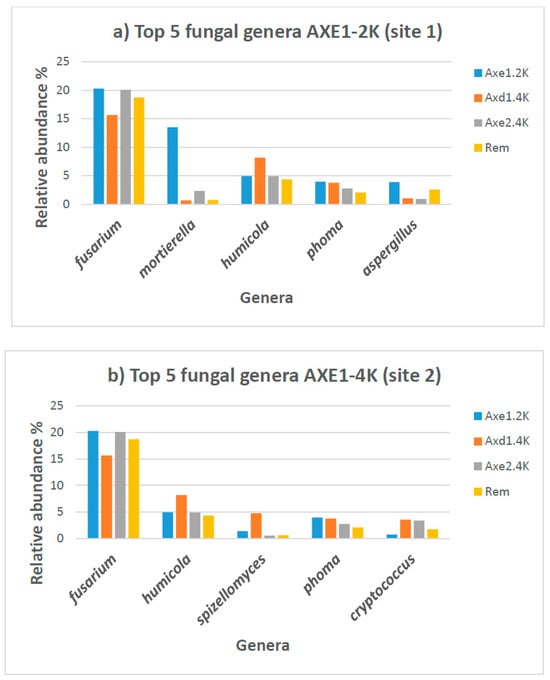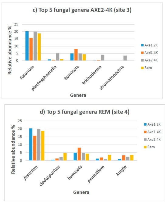 Top five fungal genera and their relative abundance in soil samples from each site along with other sites: (a) Axe1–2k: site 1 (residential area); (b) axd1-4k or Axe1-4k: site 2 (agricultural dry land); (c) Axe2-4k: site 3 (agricultural wet field); and (d) Rem: remediated tailing (site 4). Data in percentage.