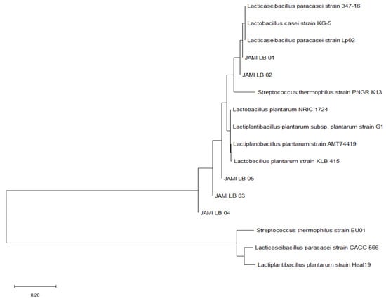 Bacteria isolated from various fermented milk and beverage samples were identified based on their 16S rRNA gene sequences. A standard strain with the highest match rate to the base sequence was selected, and a phylogenetic tree was constructed using the MEGA program (Figure 1). This analysis identified one strain of Lacticaseibacillus paracasei, one strain of Streptococcus thermophilus, and three strains of Lactiplantibacillus plantarum. The similarity of 16S sequences to that of reference strains in GenBank is shown in Table 1. Strain JAMI_LB_01, isolated from fermented soy milk, exhibited 99.80% nucleotide sequence identity with L. paracasei. Strain JAMI_LB_02, obtained from fermented soy milk, showed 99.73% similarity with S. thermophilus. Strains JAMI_LB_03, isolated from filtered fermented milk, and JAMI_LB_04 and JAMI_LB_05, isolated from fermented milk, demonstrated 99.86%, 99.93%, and 99.93% similarity to L. plantarum, respectively.