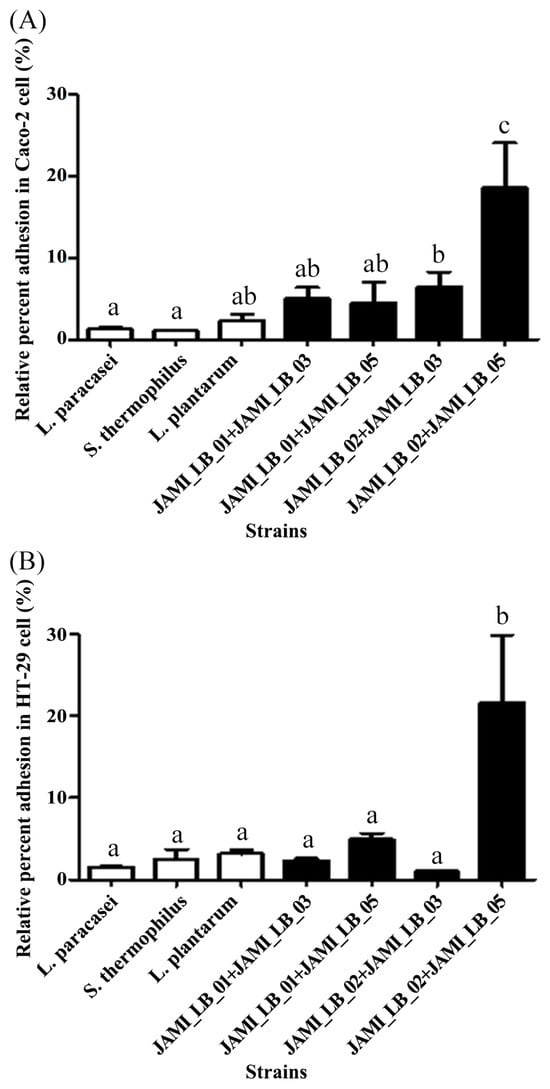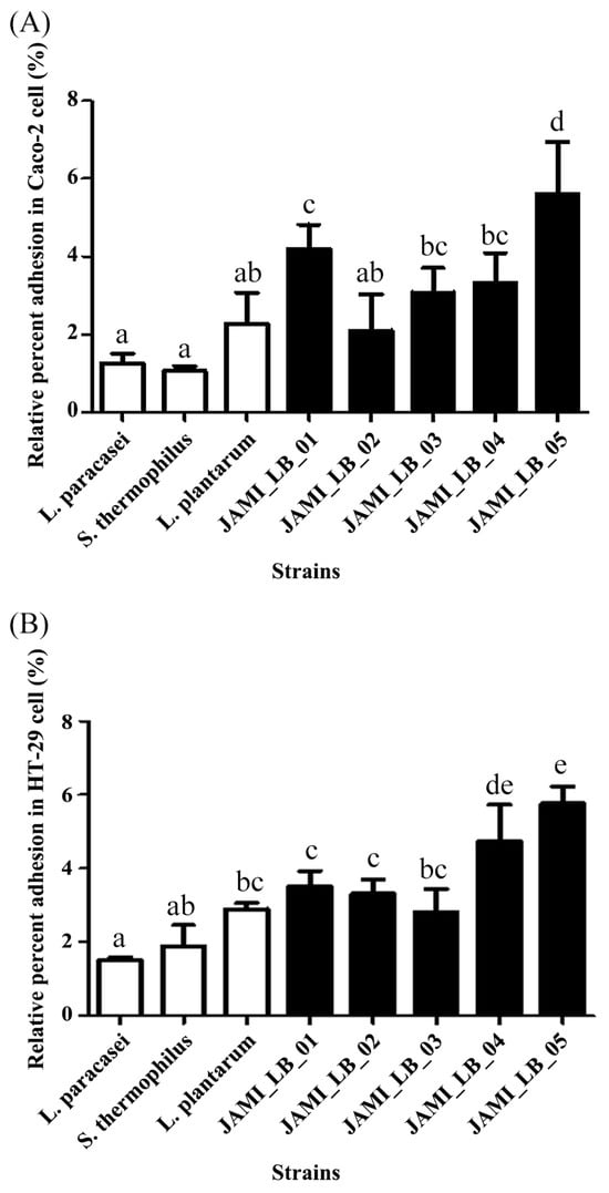 Adhesion of individual strains to (A) Caco-2 and (B) HT-29 cells. Results are expressed as means ± SD of triplicate determinations. Different lowercase letters (e.g., a, b, c, d, e) within the same line denote significant differences, as determined by Duncan’s multiple range test (p < 0.05).