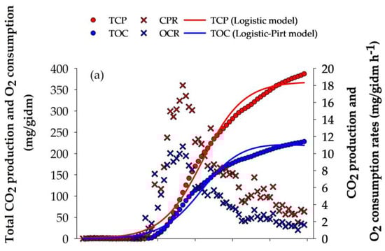 The Logistic and Pirt models were coupled as suggested by Méndez-González et al. [30] Equation (4) to describe the TOC curve. Equation (4) was integrated to estimate the O2 consumption as a function of CO2 production in Equation (5). The coefficients associated with the mass yield of CO2 per O2 consumption (YCO2/O2) and maintenance coefficient (mO2) were estimated by multilinear regression.
