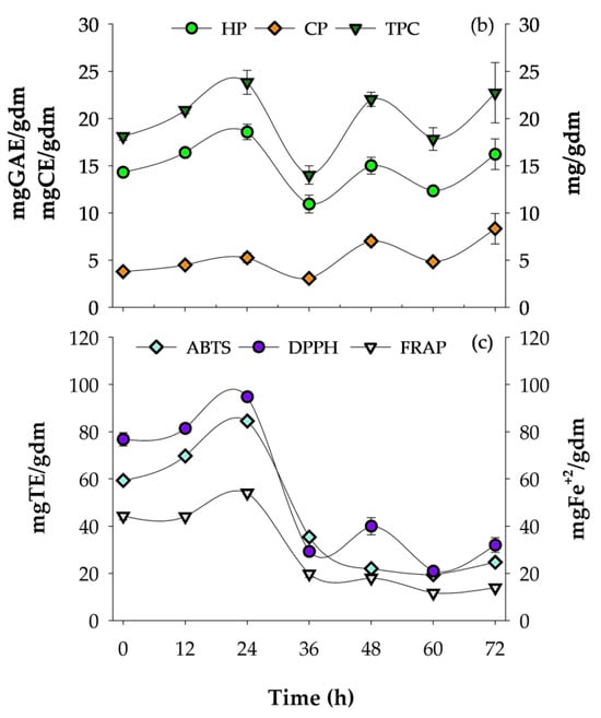 During the culture, the release of phenolic compounds and antioxidant capacity were determined using HP, CP, TPC, ABTS, DPPH, and FRAP methods (Figure 1b,c). The highest content of HP and TPC was obtained at 24 h of fermentation with values of 18.57 ± 0.83 mgGAE/gdm and 23.83 ± 1.27 mg/gdm, respectively, while the highest CP content was obtained after 72 h of fermentation (8.34 ± 1.61 mgCE/gdm). The HP and TPC content after 24 h of fermentation compared to the unfermented control showed an increase of 29.76% and 38.42%, respectively; additionally, the TPC content at 24 h of cultivation was 4.88% higher than the 72 h time, which was the second value with the highest TPC content. In contrast, the 36 h time was the lowest phenolic content presented, with a percentage of 70% lower than obtained at 24 h.