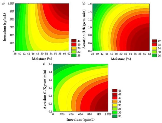 Figure 2 shows the contour plots to analyze the combined effects of factors on the extraction yield of TPC. The contour plots showed an improvement in yield extraction of TPC, ranging from 56 to 62% of moisture (Figure 2a,b), with 0.4 to 0.5 L/Kgwm min of aeration (Figure 2b,c) and an inoculum of 9 × 106 to 1.2 × 107 sp/mL (Figure 2a,c).