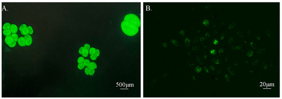 CFDA-SE labeled tomonts and theronts of I. multifiliis. ((A), tomonts. (B), theronts).