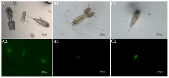 Significant fluorescent signals in the digestive tract of copepods. (A1–C1) Copepods under bright-field. (A2–C2), Copepods under dark-field fluorescent light source.