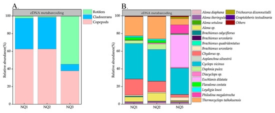 (A) relative abundance (%) of copepods, cladocerans, and rotifers and (B) relative abundance (%) top 20 of zooplankton at the species level with eDNA metabarcoding in every fish-farming pond.