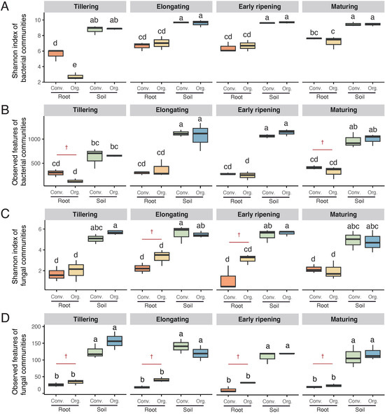 Temporal shifts in alpha-diversity of rice root and soil microbial communities across paddy types. (A–D) Shannon index and observed feature richness of bacterial (A,B) and fungal (C,D) communities in the root endosphere and bulk soil across four rice developmental stages: tillering, elongating, early ripening, and maturing. The box plots are colored as follows: brownish red for “Conv. Root”, beige for “Org. Root”, light-green for “Conv. Soil”, and blue for “Org. Soil”, “Conv.” and “Org.” represent conventional and organic paddies, respectively. Statistical significance was tested by one-way ANOVA followed by Tukey’s post hoc test. Different letters indicate statistically significant differences (p < 0.05). A dagger (†) indicates a large effect size (Cohen’s d > 0.8) between organic and conventional paddies where no statistically significant difference was detected.