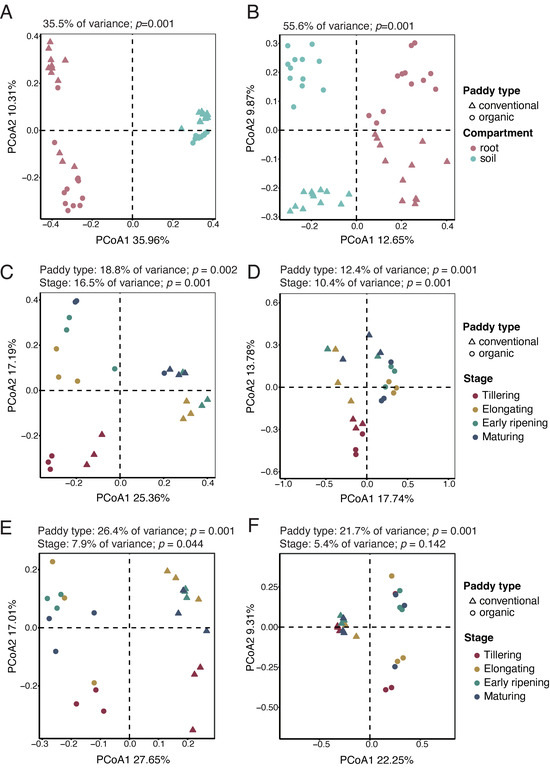 Temporal shifts in beta-diversity of rice root and soil microbial communities across paddy types. (A–F) Principal coordinate analysis (PCoA) based on Bray–Curtis distances illustrating the beta diversity of microbial communities across compartments (the root endosphere and bulk soil) and paddy types (organic and conventional). (A,B) PCoA plots of the overall bacterial (A) and fungal (B) communities, with root (red) and bulk soil (blue) samples under organic (circles) and conventional (triangles) paddies. (C,D) PCoA plots of bacterial (C) and fungal (D) communities in the root endosphere across four developmental stages and paddy types. (E,F) PCoA plots of bacterial (E) and fungal (F) communities in bulk soil across four developmental stages and paddy types. Significance values from PERMANOVA analysis, including R2 values and p-values, were annotated on the PCoA plots to highlight the degree of variation explained by compartment, paddy type, and developmental stage.