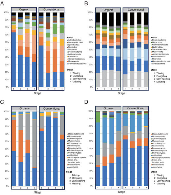 Temporal shifts in rice root and soil microbial community structure across paddy types. (A–D) Dominant microbial taxonomic groups in different compartments (the root endosphere and bulk soil) and paddy types (organic and conventional). (A,B) Bacterial community composition in the root endosphere (A) and bulk soil (B). (C,D) Fungal community composition in the root endosphere (C) and bulk soil (D). Stages 1, 2, 3, and 4 correspond to the tillering, elongating, early ripening, and maturing stages, respectively.