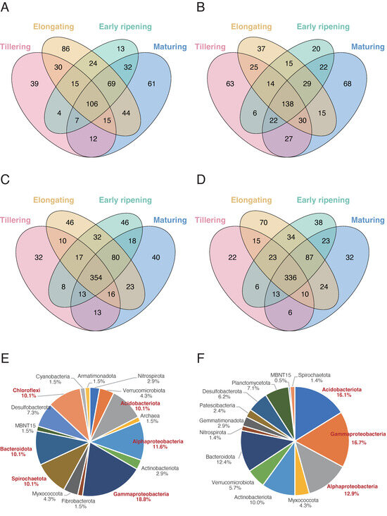 Core genera of rice root and soil bacterial communities. (A–F) Venn diagrams and pie charts of bacterial genera in the rice root endosphere and bulk soil across four developmental stages under organic and conventional paddies. (A,B) Venn diagrams showing the unique and shared genera in the root endosphere under organic (A) and conventional (B) paddies. (C,D) Venn diagrams showing the unique and shared genera in bulk soil under organic (C) and conventional (D) paddies. Each of the colored ovals represents the sampled stage. Values within intersections represent shared genera, while values outside intersections are unique to each stage. (E,F) Pie charts of the shared core bacterial microbiome, with 69 genera in the root endosphere (E) and 280 genera in bulk soil (F), summarizing the dominant phyla in the shared microbiomes. The top three phyla, ranked by proportion, are highlighted in red.