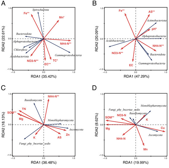 Correlation between dominant rice root and soil microbial communities and soil physicochemical properties. (A,B) Redundancy analysis (RDA) plots showing relationships between the dominant bacterial phyla in the root endosphere (A) and bulk soil (B) and soil physicochemical properties. (C,D) RDA plots showing relationships between the dominant fungal phyla in the root endosphere (C) and bulk soil (D) and soil physicochemical properties. Red and black arrows indicate soil physicochemical factors and dominant microbial phyla, respectively. Key soil physicochemical variables include ammonium nitrogen (NH₄⁺-N), total nitrogen (TN), total carbon (TC), nitrate nitrogen (NO3⁻-N), electrical conductivity (EC), soil organic matter (SOM), available silica (AS), pH, magnesium (Mg), zinc (Zn), manganese (Mn), copper (Cu), potassium (K), and iron (Fe). Arrow lengths denote the strength of influence, and the angle between soil physicochemical factors and microbial taxa indicates their relationship: acute angles represent positive correlations, while obtuse angles indicate negative correlations. The percentage of variance explained by each RDA axis is indicated along the axes. Asterisks indicate a significant correlation at p < 0.05, while double asterisks indicate a highly significant correlation at p < 0.01.