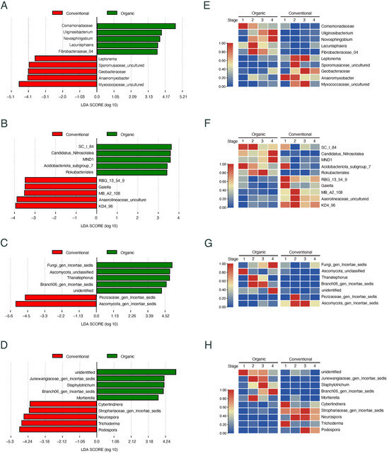 Differential rice root and soil microbial biomarkers between organic and conventional paddies. (A–D) Linear discriminant analysis (LDA) scores of bacterial and fungal biomarkers with LDA > 2 in the root endosphere (A,C) and bulk soil (B,D). Red bars indicate biomarkers enriched in the conventional paddy, while green bars represent biomarkers enriched in the organic paddy. (E–H) Heatmaps showing the relative abundance of biomarkers across four developmental stages in organic and conventional paddies, for the root endosphere (E,G) and bulk soil (F,H). The relative abundance of each genus was normalized to a maximum value of 1.00 for comparison. Stages 1, 2, 3, and 4 correspond to the tillering, elongating, early ripening, and maturing stages, respectively. Colors represent relative abundance, with red indicating higher abundance and blue indicating lower abundance. Detailed taxonomy information corresponding to microbial taxa in the microbial databases (the SILVA 138 database for bacteria and the UNITE database for fungi) is provided in Table S6. The ’unidentified’ taxa represent sequences not confidently assigned to known species in the microbial reference databases. These taxa in different plots are independently derived and may not correspond to the same microbial groups.