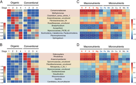 Developmental stage-enriched rice root bacterial biomarkers and their correlation with leaf mineral nutrient concentrations. (A,B) Heatmaps showing the relative abundance of bacterial biomarkers across each developmental stage in the rice root endosphere in organic (A) and conventional (B) paddies. The relative abundance of each genus was normalized to a maximum value of 1.00 for comparison. (C,D) Heatmaps showing the correlations between bacterial biomarkers in the root endosphere and concentrations of leaf mineral nutrients, including six macronutrients and seven micronutrients, in rice under organic (C) and conventional (D) paddies. The concentrations of each mineral nutrient were normalized such that the maximum deviation from the mean was set to 1.0 for comparison. Red and blue indicate highly mobile and low-mobility mineral nutrients, respectively. Significant correlations are marked by * (p < 0.05) and ** (p < 0.01). Stages 1, 2, 3, and 4 correspond to the tillering, elongating, early ripening, and maturing stages, respectively. The colors represent biomarkers enriched at different developmental stages: light-pink for tillering, light-beige for elongating, pastel-green for early ripening, and pale-blue for maturing. Detailed taxonomy information corresponding to microbial taxa in the SILVA 138 database is provided in Table S7.