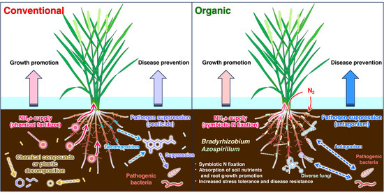 Proposed model for root-associated microbial functions in conventional and organic paddy fields. The diagram illustrates key differences in microbial processes between conventional (left) and organic (right) paddy fields. The white area represents the atmosphere. The blue area represents the water layer. The brown background represents the paddy soil environment. Dots of different colors represent bacteria with different functions, specifically, light-yellow and light-green dots represent Bradyrhizobium and Azospirillum, respectively. In conventional paddies, plant growth is promoted by chemical fertilizers that supply NH₄⁺, while disease prevention relies on pathogen suppression through microbicides. In organic paddies, rice growth is promoted via symbiotic nitrogen fixation by beneficial bacteria, such as Bradyrhizobium and Azospirillum, which convert atmospheric N2 into NH4⁺, enhancing nutrient absorption and root growth. Disease prevention is achieved through microbial antagonism, with diverse fungi and bacteria suppressing pathogens, resulting in improved stress tolerance and resistance.