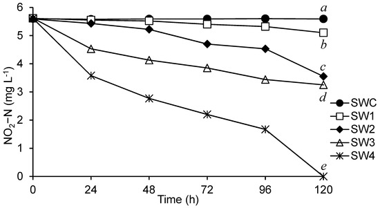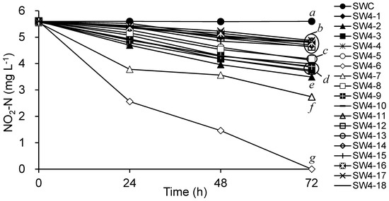 Comparative study of nitrite-N reduction by isolates from SW4 samples. SWC: medium without microorganism inoculation. Data are presented as mean ± S.E. Data labeled with different letters at the end of the experiment indicate significant differences among treatments (p < 0.05). n = 3.