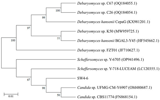 Following a 2-day incubation period, the SW4-6 isolates displayed round, smooth, and well-defined edges, with a white creamy appearance (Supplementary Figure S1). These colonies grew at temperatures ranging from 20 to 40 °C and demonstrated tolerance to salinity levels within the range of 0.5~12% (Table 2). The size of the isolate was approximately 2 µm, and pseudohyphae were not observed under the microscope (Figure 3). The ITS sequence was employed to identify the nitrite-N reduction capabilities of the SW4-6 isolate. A 624 bp ITS sequence was determined and deposited in GenBank under accession number PP757925. To elucidate the phylogenetic relationships between the SW4-6 isolate and existing isolates, a combined dataset of ITS sequences for the yeasts was selected from the NCBI database to generate a phylogenetic tree (Figure 4). All sequences obtained revealed that the SW4-6 isolate showed 100% and 98.1% similarity to the Candida sp. CBS11774 (GenBank accession number: FN868154.1) and Candida sp. UFMG-CMY6907 (GenBank accession number: OM480687.1) strains, respectively, which were grouped together in the same clade and indicated a strong supportive bootstrap value. Based on the morphological characteristics, ITS sequence and phylogenetic analysis, it was confirmed that the isolate was Candida sp.