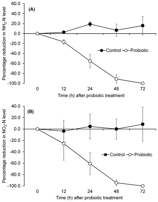 The ammonia-N and nitrite-N levels in water were entirely reduced when probiotics were applied to the shrimp ponds at a C/N ratio of 15 (Figure 5A,B). No reduction in ammonia-N and nitrite-N was observed in the control ponds; however, following the addition of the probiotic and sugar, the concentrations of ammonia-N and nitrite-N decreased after 6 h, achieving complete elimination by 72 h of probiotic treatment.