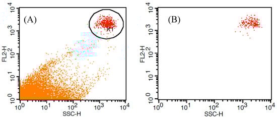Flow cytometry is a rapid and effective method for quantitative analysis of individual cells in a moving fluid. Microalgae are ideal for flow cytometry analysis because they are unicellular and contain photosynthetic pigments that exhibit autofluorescence []. Moreover, the flow cytometric measurement of algal lipid content is one of the most cost-effective and time-efficient methods for labeling cells with lipophilic fluorescent dyes [,].