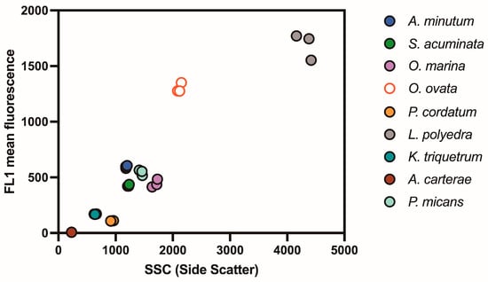 Similarly, when the size was determined as the equivalent spherical diameter (ESD) using a Coulter Multisizer, P. micans and O. ovata exhibited comparable ESD sizes; however, O. ovata displayed significantly higher FL1 fluorescence (Figure 4B). The size of P. micans was underestimated when measured by flow cytometry, likely because of its distinctive cell shape, which is the form of teardrop with a wide valve and appears lenticular in the lateral view as a result of compression.