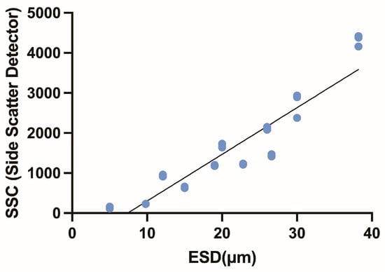 Correlation between experimental cell size measured with a Coulter counter (X-axis, ESD) and flow cytometry (SSC: Side Scatter Detector fluorescence). R2 value is 0.86.