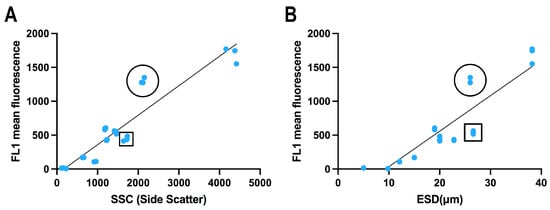 Correlation between the lipid content of nine dinoflagellate species labelled with BODIPY 505/515 and the size factor. (A) Size factor measured by flow cytometry (SSC); (B) size measured by Coulter Multisizer (ESD). Open circles indicate Ostreopsis ovata and open squares indicate Prorocentrum micans. R2 value is 0.87 and 0.81, respectively.
