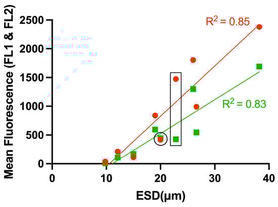 We also compared the mean fluorescence of experimental species and their equivalent spherical diameters (ESD) when stained with Nile Red and BODIPY 505/515 (Figure 6). The fluorescence intensity of Nile Red showed a linear correlation with ESD (R2 = 0.85), and the correlation coefficient was similar than that observed for BODIPY fluorescence (R2 = 0.83). While both stains exhibited a linear correlation between mean fluorescence and ESD, the Nile Red correlation exhibited a steeper gradient, indicating a potential overestimation of lipid content with this dye.
