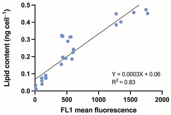 The formation of lipids is strongly correlated with algal growth, which is affected by environmental conditions such as light intensity and nutrient concentration [,,]. Changes in light intensity can positively or negatively affect lipid production. Moreover, nitrogen starvation has often been reported to lead to an increase in lipid accumulation []. Therefore, it is crucial to monitor changes in lipid content during cultivation using rapid and simple methods to optimize the conditions for mass production of microalgae [,]. This study revealed a significant correlation between the relative lipid content estimated by flow cytometry using BODIPY 505/515, and the lipid content determined by the sulfo-phospho-vanillin (SPV) reaction in the experimental species (Table 2, Figure 7). The actual lipid content was estimated using the established flow cytometry conditions and BODIPY 505/515 staining by applying the slope value (multiplying FL1 fluorescence by 0.0003 and adding 0.06). Thus, the flow cytometry configurations established in this study offer an efficient and rapid flow cytometric technique for estimating lipid content in dinoflagellate species.