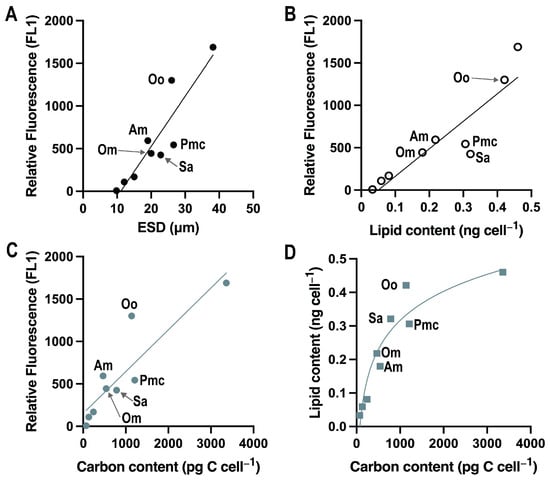 Correlations between BODIPY 505/515 fluorescence (FL1) and size (ESD; (A)), lipid content ([]; (B)) and carbon content (C) of nine dinoflagellate species, and correlation between lipid content and carbon content (D). Oo = O. ovata; Am.= A. minutum; Pmc, P. micans; Sa, S. acuminata; Om, O. marina.