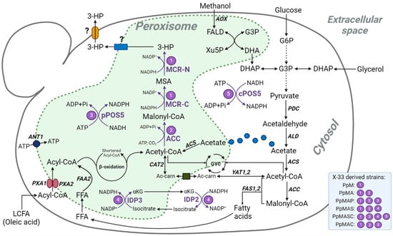 - Zhai, X.; Gao, J.; Li, Y.; Grininger, M.; Zhou, Y.J. Peroxisomal metabolic coupling improves fatty alcohol production from sole methanol in yeast. Proc. Natl. Acad. Sci. USA 2023, 120, e2220816120. [Google Scholar] [CrossRef]