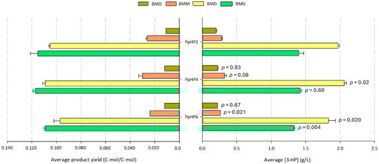 - Fina, A.; Brêda, G.C.; Pérez-Trujillo, M.; Freire, D.M.G.; Almeida, R.V.; Albiol, J.; Ferrer, P. Benchmarking recombinant Pichia pastoris for 3-hydroxypropionic acid production from glycerol. Microb. Biotechnol. 2021, 14, 1671–1682. [Google Scholar] [CrossRef] [PubMed]
