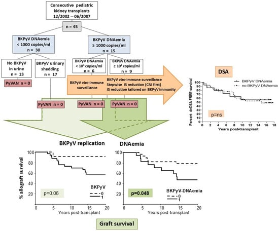 - Ginevri, F.; Azzi, A.; Hirsch, H.H.; Basso, S.; Fontana, I.; Cioni, M.; Bodaghi, S.; Salotti, V.; Rinieri, A.; Botti, G.; et al. Prospective Monitoring of Polyomavirus BK Replication and Impact of Pre-Emptive Intervention in Pediatric Kidney Recipients. Am. J. Transplant. 2007, 7, 2727–2735. [Google Scholar] [CrossRef] [PubMed]