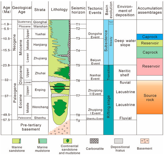 Major tectonic events, lithology, and sea level change in the Baiyun Sag, Pearl River Mouth Basin, modified from Zhang, et al. [33].