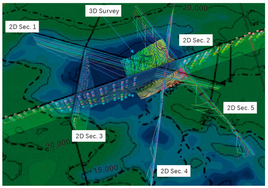 All available data are utilized to establish the geological model framework (horizons in the depth domain), which includes three interpreted seismic sections (2D Sec. 1–3) from the literature, two sections of 2D seismic survey (2D Sec. 4–5) from the Guangzhou Marine Geological Survey (GMGS), and a 3D seismic survey from GMGS (Figure 3). Three sections (2D Sec. 1–3) from the literature are digitized, and the horizons are integrated with other data to construct the framework of the geological model. Due to the various data sources, the data quality varies. Discrepancies and mismatches between the data are resolved by following a priority or reliability order: 3D seismic survey, 2D seismic survey, and digitized section data from the literature. These various data sources cover the entire Baiyun Sag, which is located in the southern part of the Pearl River Mouth Basin (PRMB)