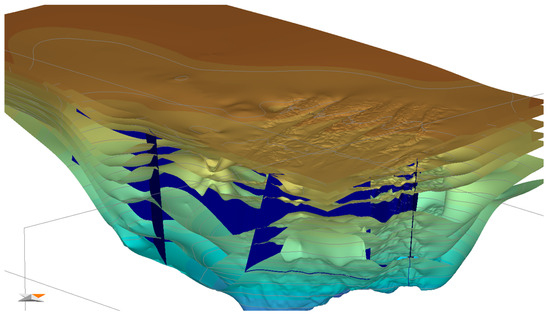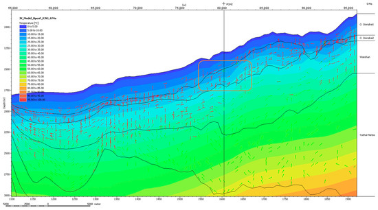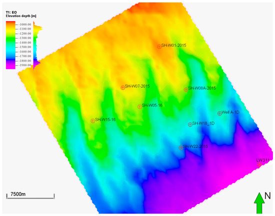 The 3D geological model properties, such as lithology and source rock parameters, including total organic carbon (TOC), hydrogen index (HI), and source rock kinetics, are from the available seismic and drilling data (Figure 8). Additionally, geological ages were assigned to each formation. Finally, boundary conditions, including heat flow (HF), paleo water depth (PWD), and sedimentary water interface temperature (SWIT), were established based on previous study results from public papers [15,29,38].