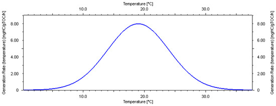 Fujii, et al. [4] used a model with a peak temperature of 12.5 °C based on laboratory-derived pentamethylicosane (one of the biomarkers for methanogenic archaea) analytical results from core samples. Considering these literature research results and the uncertainty of laboratory testing, three possible kinetics models are proposed in this study (Figure 5, Figure 6 and Figure 7).