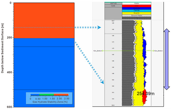 Gas hydrate stability zone (GHSZ) simulation results compared with petrophysical interpretation results in the W17 well.
