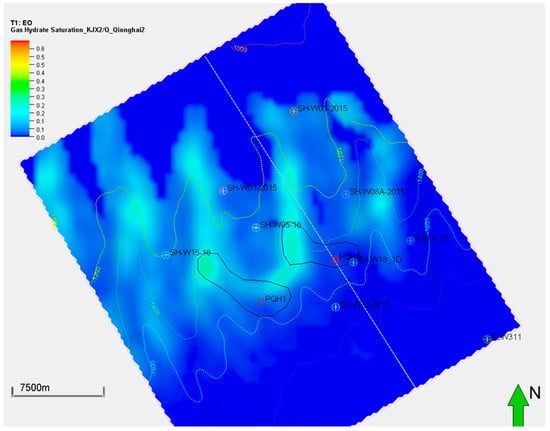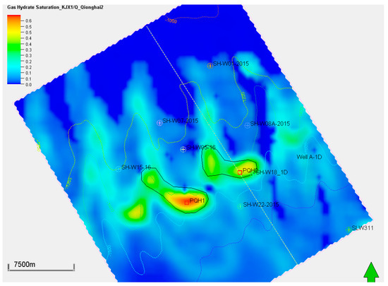 Gas hydrate saturation distribution of the targeted interval of QH2 using the low-temperature generation model (K1). The green arrow represents the North.