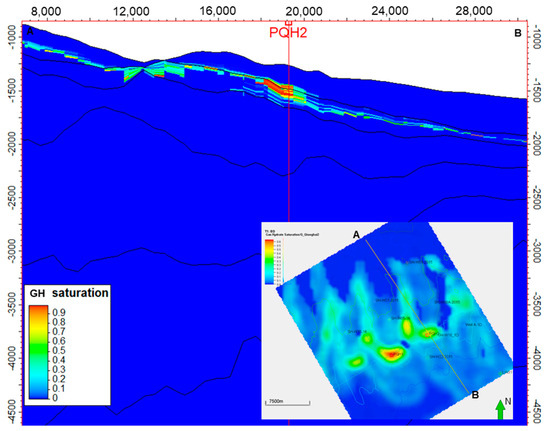 Gas hydrate saturation distribution (section AB) derived from the low-temperature model (K1). The green arrow represents the North.